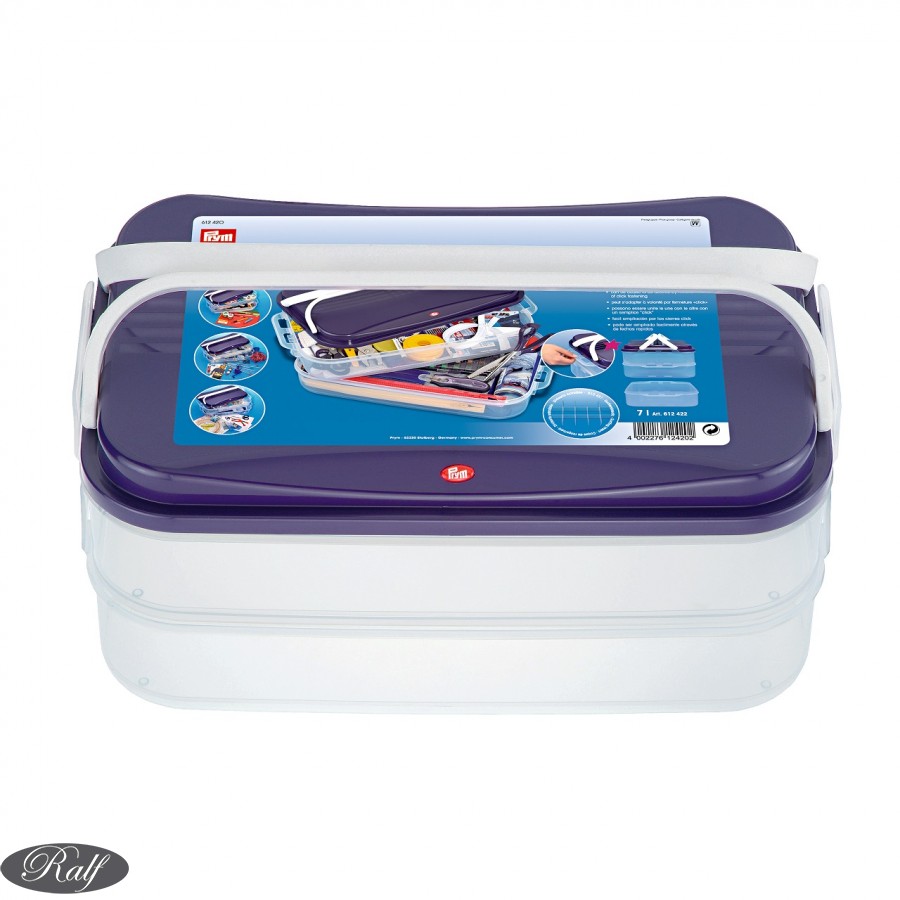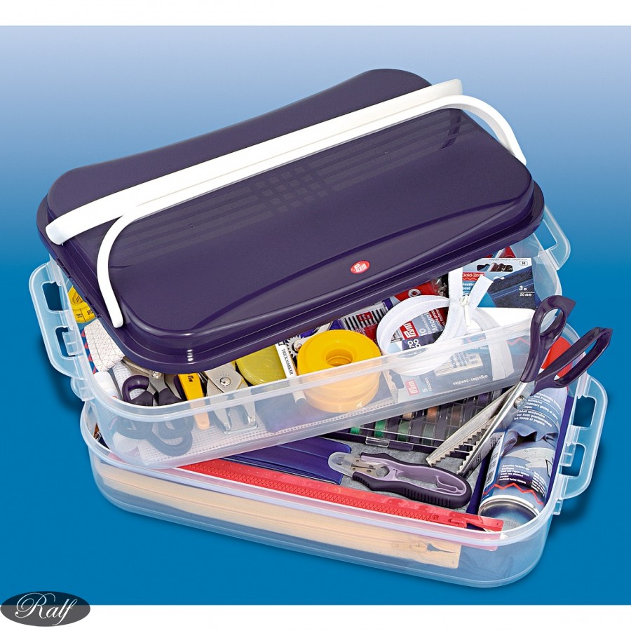Accesoriile pt lucru de mana de dimensiuni mari in special, pot gasi fara efort spatiu in cutia pt lucru JUMBO, de ex. tesaturi, foarfece, adezivi sau rigle. Doua module, din plastic stabil și transparent, ofera suficient spatiu pentru depozitarea oricarui echipament de cusut, artizanat si hobby cu cate 7 litri capacitate de umplere fiecare. Capacul din plastic albastru pruna este fabricat din plastic robust si inchide bine modulul de sus. Cutia pt lucru JUMBO este de asemenea potrivita pentru transport: un mâner alb, practic, pliabil, asigura confortul transportului. Datorita fixarii sale securizate, cutia pt lucru poate fi extinsa fara efort cu mai multe module de expansiune cu o capacitate volumetrică de 7 litri. Fireste, modulele de expansiune pot fi folosite si separat pentru depozitarea articolelor de cusut, obiecte de artizanat si hobby-uri.