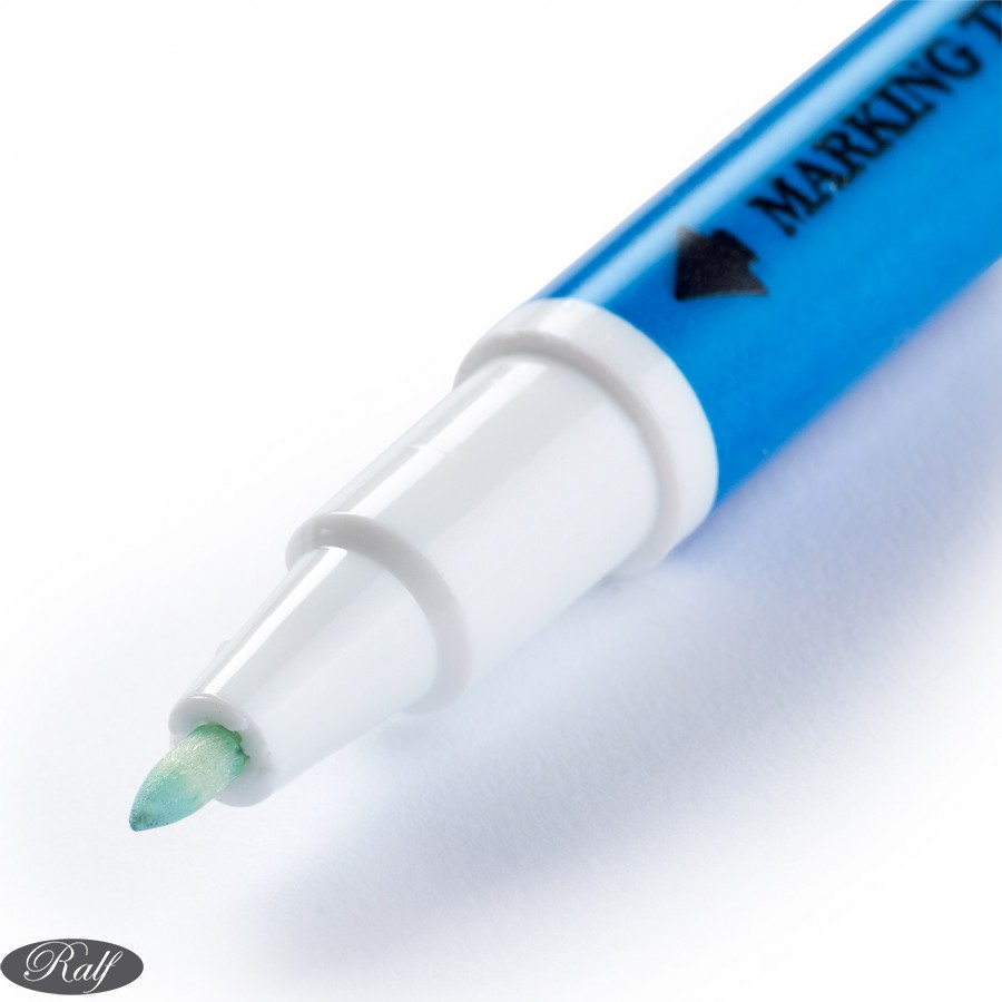Acest stilou de marcare care poate fi sters cu apa marca Prym, are multe de oferit pe ambele parti. Pe de o parte, exista un cartus cu varf de pâslă si rezervor cu cerneala turcoaz ce se sterge cu apa foarte usor din material. La celalalt capat al stiloului de marcare se afla un cartus de stergere, care poate fi utilizat pentru a sterge detalii relativ fine pe suprafete mai mici. Marcajele trasate trebuie sa fie indepartate de pe tesatura, inainte de a fi calcate, deoarece căldura din fier le va fixa permanent. Acest marcator este potrivit pentru croitorie, patchwork, quilting și broderie. Depozitarea marcatorului in pozitie verticala va impiedica uscarea acestuia. Important: înainte de a utiliza stiloul de marcare, folositi-l pentru a marca o bucata de tesatura si apoi testati indepartarea semnelor din acea bucata de material.