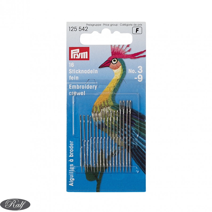 Acele Crewel, din otel calit cu cu ochiul aurit, sunt potrivite in special pentru broderii fine si pentru coasere. Acestea au forma conica si subtire tipica a unui ac de cusut manual cu ochiul relativ mare, ceea ce face ca filetarea in general sa fie mai usor de facut manual. Suprafata de acoperire neteda si neporoasa asigura faptul ca acul aluneca cu usurinta prin tesatura. Gama de ace Crewel include dimensiuni de la 3 la 9 si ofera astfel acul potrivit pentru fiecare cerinta atunci cand brodati. Prym are, de asemenea, doua serii sortate de ace speciale de broderie in dimensiuni 3-9 si 5-10. Toate pachetele contin 16 ace.